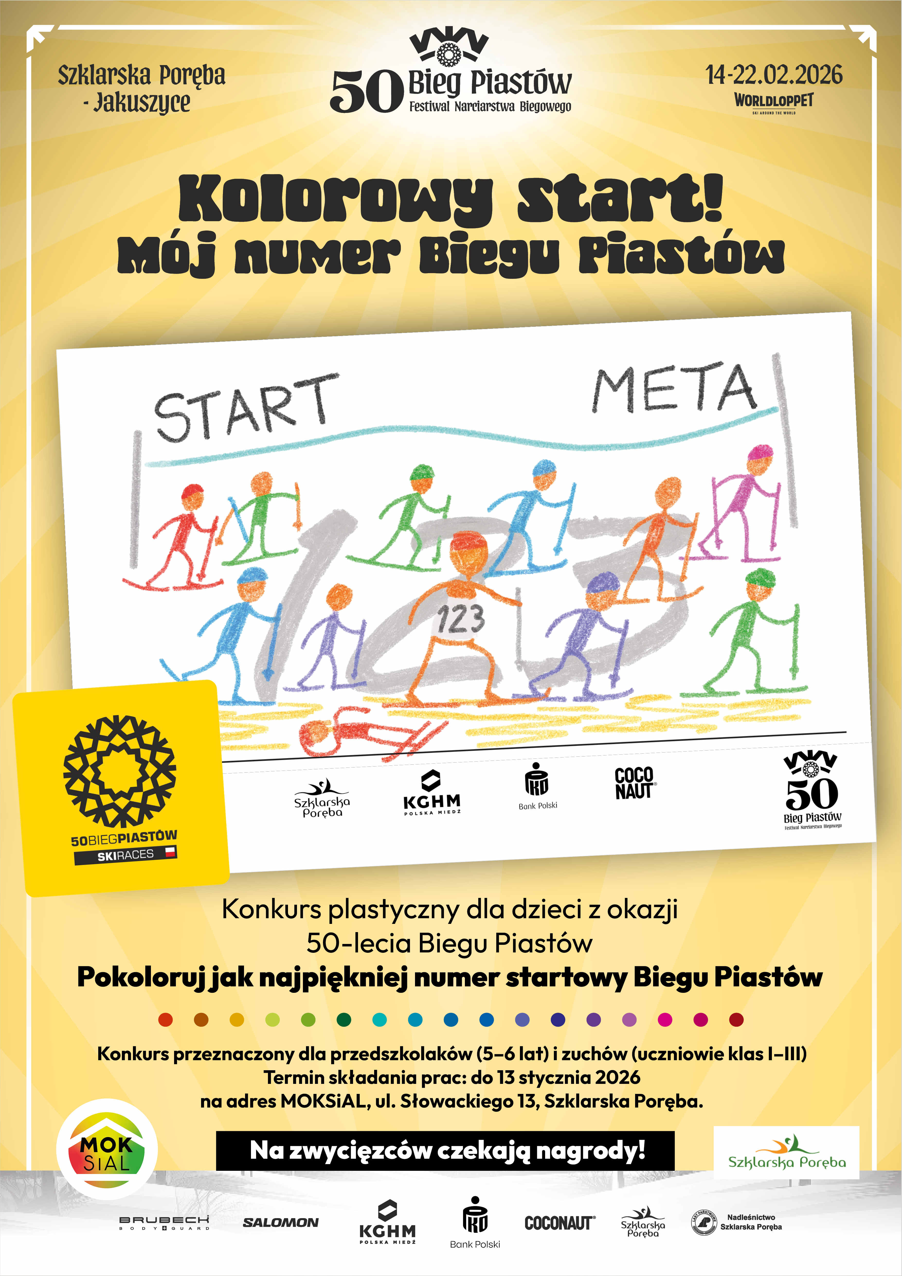 Dlatego już dziś zapraszamy najmłodszych mieszkańców Szklarskiej Poręby i regionu do udziału w konkursie plastycznym pn. „Kolorowy start! Mój numer Biegu Piastów”.