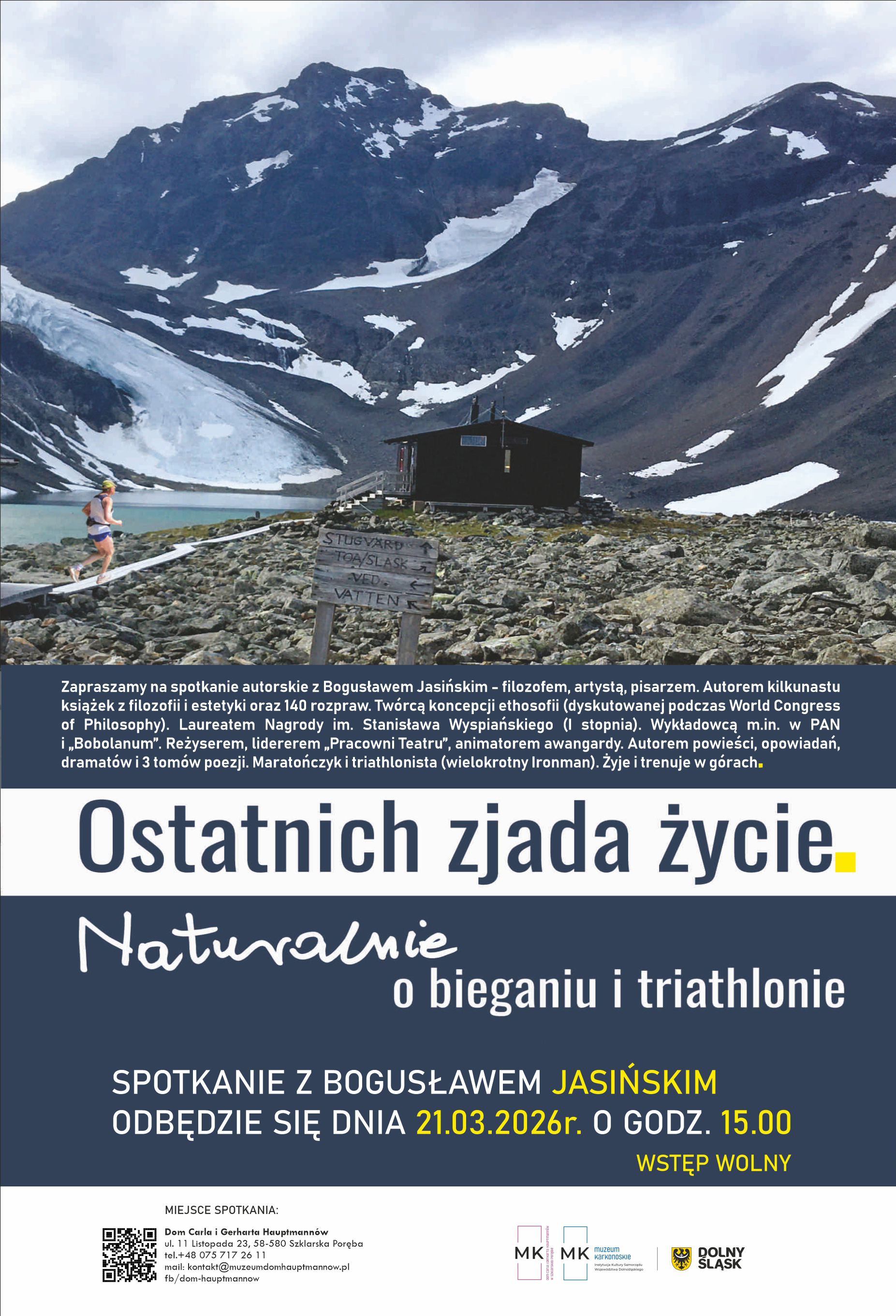 Zapraszamy dnia 21.03.2026r. o godz. 15.00 do Domu Carla i Gerharta Hauptmannów w Szklarskiej Porębie na spotkanie autorskie z Bogusławem Jasińskim. Filozofem, artystą, pisarzem.